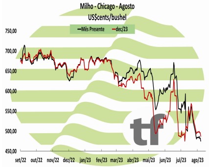 CAUSAS DA QUEDA: O milho negociado em Chicago fechou o dia e a semana em queda. Com uma batalha interna entre fatores altistas e baixistas no relatório WASDE do USDA, o milho acabou cedendo com um clima favorável e a forte concorrência externa. O USDA reduziu sua estimativa de produção nos EUA em 2023/24 para 15,111 bilhões de bushels (383,82 milhões de toneladas), em comparação a 15,32 bilhões de bushels (389,13 milhões de toneladas) em julho. Quanto aos estoques globais, a estimativa foi reduzida de 314,1 milhões para 311,1 milhões de toneladas. Os dados, apesar dos cortes, deixam os compradores relativamente mais tranquilos em relação à aquisição de matéria-prima. Sendo assim, a melhora no déficit hídrico, apontado pelo USDA no dia anterior, assim a forte pressão da concorrência internacional, principalmente vinda do Brasil e Argentina pressionaram a cotação. Com isso o milho fechou a semana em baixa de -2,01% ou $-10,00 cents/bushel para a cotação de dezembro23.
