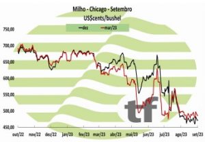 FECHAMENTOS DO DIA 06/09: A cotação para setembro23, referência para a nossa safra de inverno, fechou em alta de 0,11 % ou $ 0,50 cents/bushel a $ 471,50 A cotação de dezembro23, a principal data negociada nos EUA, fechou em baixa de -0,05 % ou $ – 0,25 cents/bushel a $ 485,75.