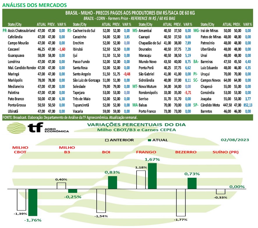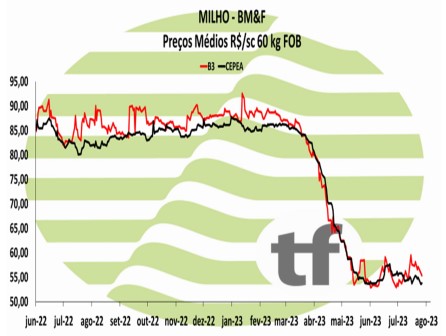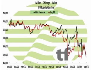 CAUSAS DA BAIXA: O milho negociado em Chicago fechou em baixa pela sétima sessão consecutiva. Os fatores baixistas se mantém e continuam exercendo uma pressão sobre o cereal. O clima mais favorável para as lavouras no cinturão do milho/soja nos EUA, o avanço da grande safra brasileira e a adesão do produtor argentino ao programa de incentivo a exportação não dão espaço para uma recuperação das cotações do milho. A produção de etanol nos EUA ficou abaixo da expectativa do mercado, o que colaborou para a queda. Novos ataques aos portos ucranianos no Rio Danúbio não surtiram o mesmo efeito que na semana passada e o mercado parece ter precificado essa etapa do conflito.