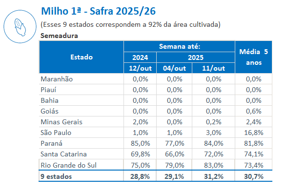 No PR, o plantio já ocorreu em 84% da área prevista, com a maioria das áreas em desenvolvimento vegetativo e em boas condições. A exceção são algumas áreas do norte do estado que já apresentam sintomas de deficit hídrico, devido aos baixos volumes de chuva ocorridos. Em SC, o plantio avança e as lavouras são favorecidas pelas chuvas frequentes.