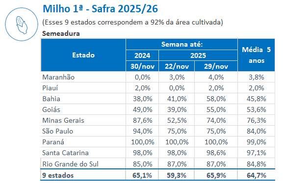 No PR, o tempo mais seco no estado permitiu a realização dos tratos culturais. Em SC, o plantio se aproxima da finalização e a redução das chuvas favoreceu o desenvolvimento da cultura. No MA e PI, o plantio foi iniciado. Em GO, a semeadura está na reta final nas regiões Leste e Norte.