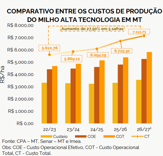 O projeto CPA – MT divulgou o 1º relatório de custo de produção para o milho da safra 26/27.
