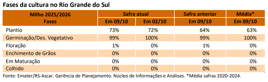 As chuvas expressivas no período dificultaram a semeadura de milho em diversas regiões do Estado, como na Fronteira Oeste, onde os acumulados passaram de 110 mm, e prejudicaram o trânsito de máquinas pesadas nas lavouras. Há relatos de falhas no estande de plantas em alguns locais como resultado das chuvas volumosas em semanas anteriores, que causaram germinação irregular. Além disso, as baixas temperaturas no Alto Uruguai reduziram o ritmo de crescimento das plantas.