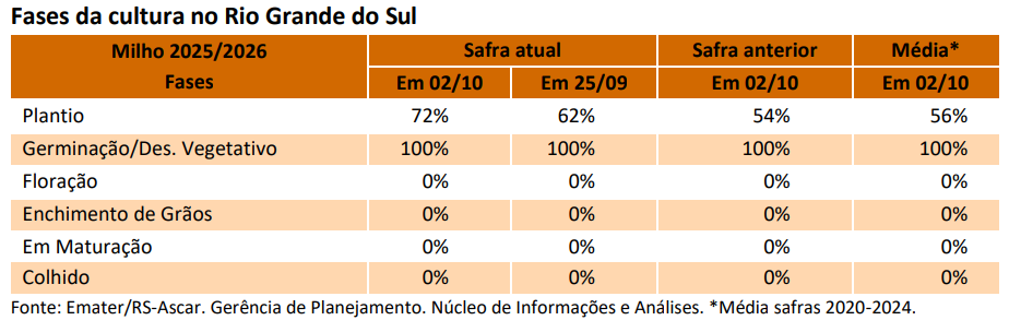Na de Bagé, na Fronteira Oeste, o tempo seco e a adequada luminosidade beneficiaram o desenvolvimento das lavouras e o avanço da semeadura, inclusive em locais com necessidade de replantio. Em Maçambará, dos 3.000 hectares previstos 93% estão plantados. Em São Borja, o plantio foi praticamente encerrado; restam apenas lavouras em terras baixas, onde o excesso de umidade ainda não viabilizou a conclusão da semeadura. Os produtores efetuam o controle de ervas daninhas com herbicidas e a aplicação de fertilizantes nitrogenados e potássicos em cobertura. O monitoramento da cigarrinha-do-milho indica baixa presença do inseto na região.