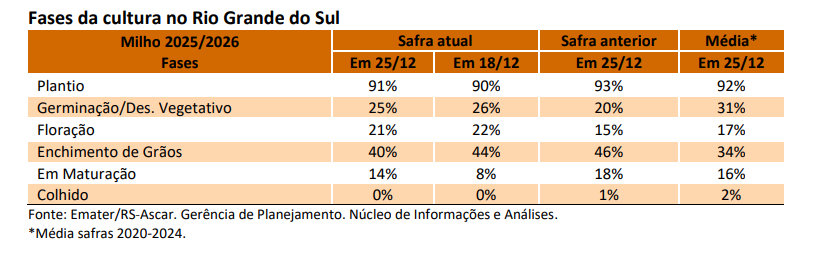 A cultura do milho apresenta elevada variabilidade de desenvolvimento e desempenho produtivo no Estado como reflexo da distribuição irregular das chuvas e da ocorrência de ondas de calor a partir da segunda quinzena de novembro. As condições ambientais no início do ciclo favoreceram o crescimento vegetativo em grande parte das lavouras. Contudo, a restrição hídrica subsequente impactou negativamente áreas de sequeiro, especialmente aquelas em fases sensíveis do ciclo, como pendoamento, floração e enchimento de grãos.