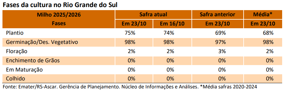 Na região administrativa da Emater/RS-Ascar de Bagé, na Campanha, a semeadura se encontra em ritmo moderado, e os produtores aguardam o retorno das chuvas para prosseguir, evitando o plantio sob baixa umidade do solo. Na Fronteira Oeste, em São Borja, a área estimada de plantio é de 22 mil hectares, e as lavouras implantadas em agosto estão em fase de floração. Em Itaqui e Maçambará, as baixas temperaturas e o excesso de umidade durante a emergência resultaram em desuniformidade de plantas e falhas, sem possibilidade de replantio, comprometendo parte do potencial produtivo. O controle de ervas daninhas prossegue, e não há registro significativo de cigarrinha-do-milho.