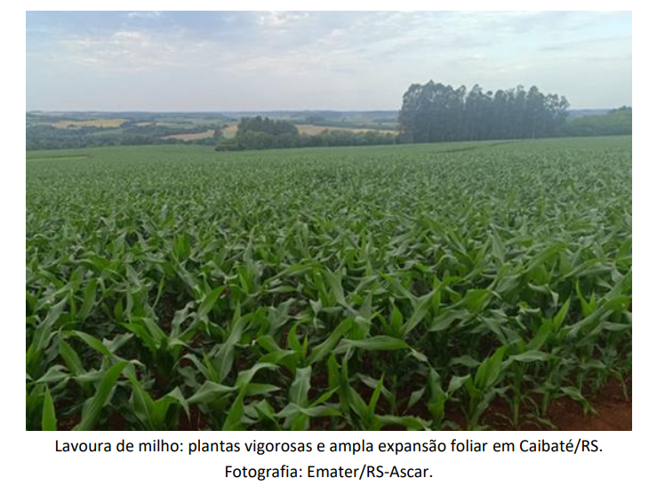 Na de Caxias do Sul, as lavouras apresentam bom desenvolvimento vegetativo, mas ainda limitado pelas baixas temperaturas e pelas geadas, ocorridas em áreas de maior altitude. O plantio está praticamente concluído em municípios do entorno de Vacaria. Nos Aparados da Serra, como em Cambará do Sul e São José dos Ausentes, a semeadura ocorrerá principalmente em novembro.