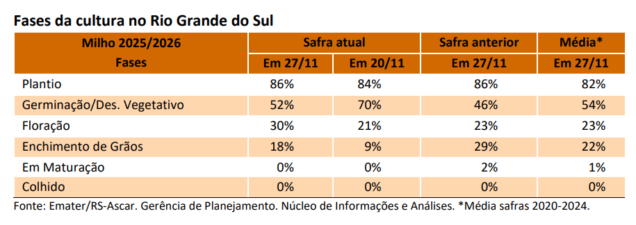 As condições fitossanitárias estão adequadas. Contudo, há registros pontuais de cigarrinha-do-milho, que está sob controle. Estima-se o cultivo de 785.030 hectares e produtividade de 7.370 kg/ha, segundo a Emater/RS-Ascar.