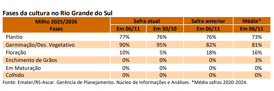 Na de Erechim, 100% da área está em estádio vegetativo, com sanidade e crescimento apropriados. Na de Frederico Westphalen, os cultivos estão em fase vegetativa, e há significativa incidência de cigarrinha-do-milho e de percevejo. Os produtores efetuam a adubação nitrogenada em cobertura. Em Sarandi e Barra Funda, ainda são levantados os prejuízos provocados pelo granizo, que atingiu a região em 03/11.