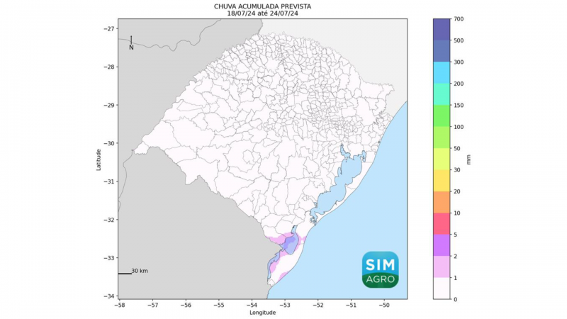 A tendência para o início da semana é de precipitação no Sul e aumento de temperaturas. Na segunda-feira (22/07), haverá um enfraquecimento do cavado em altos níveis seguido por escoamento divergente. Em baixos níveis, o Jato de Baixos Níveis voltará a atuar sobre o Estado, trazendo ar quente e úmido da Amazônia, o que pode levar ao aumento das temperaturas.