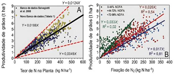 Na soja, o aporte de N via fixação biológica pode variar de 0 a 98% (Figura 1) já que é um processo sensível às condições de acidez do solo (Ciampitti & Savagiotti, 2018), déficit hídrico, a temperatura do solo (Soares Novo et al., 1999) e cepas ineficientes de Bradyrhizobium. Na figura 1, podemos observar que a soja pode apresentar diferentes produtividades, com a mesma quantidade de N, por exemplo, uma lavoura que absorbe 300 kg N ha-1, pode produzir 1,5 t ha-1 quando outro fator limita o crescimento ou pode produzir 5,6 ha-1 em condições de ótimo crescimento (Figura 1).