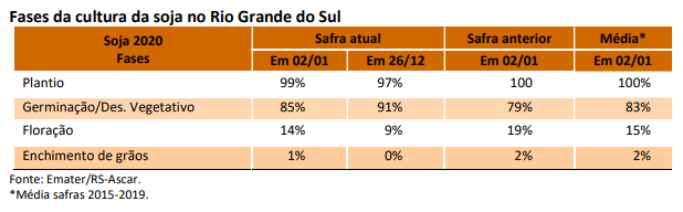 No período, o plantio da soja no RS alcançou 99% da área prevista para a safra de 5.978.967 hectares. Das lavouras com a cultura, 85% estão na fase de desenvolvimento vegetativo, 14% em floração e 1% na fase de enchimento de grãos.