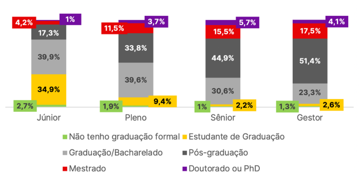 Em ambos os setores, os profissionais apresentam o nível de escolaridade como característica comum para o avanço de cargo. A pós-graduação tem sido uma alternativa para profissionais graduados avançar no mercado de trabalho. Se tratando de profissionais de dados, independentemente do nível profissional (júnior, pleno, sênior ou gestor), a maioria dos cargos mais altos são ocupados por profissionais com pós-graduação (figura 1).