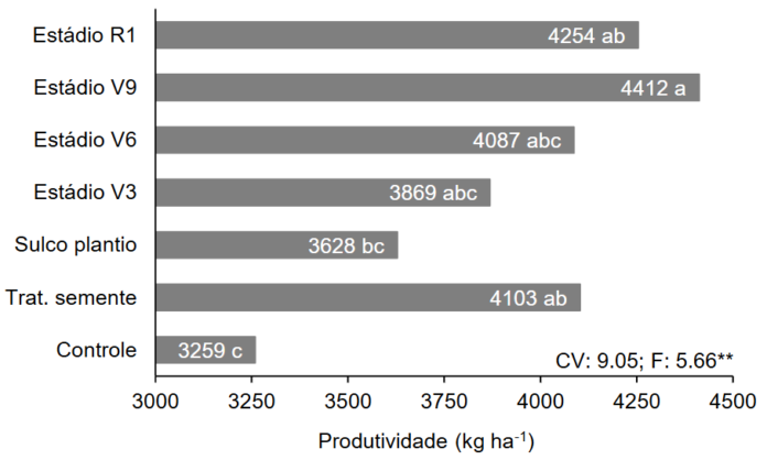 Com base nos resultados encontrados por Rezende et al. (2025), a produtividade da soja foi uma das variáveis mais influenciadas pelo posicionamento do biorregulador quanto a época de aplicação. De acordo com Rezende et al. (2025) a aplicação realizada no estádio V9, proporcionou o maior resultado para a produtividade de grãos, diferindo do tratamento controle (Figura 2). Nesse caso, a produtividade foi significativamente superior em relação ao controle, com incremento de produtividade de mais de 35%.