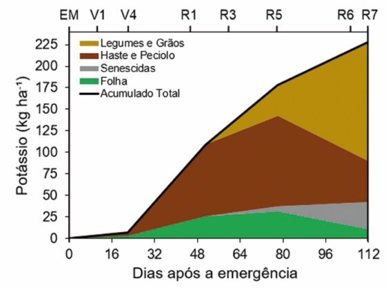 O Potássio (K) é considerado o segundo nutriente mais requerido pela soja, sendo necessários, em média 48 kg de Potássio para cada tonelada de soja produzida, incluindo grãos e resíduos culturais (Oliveira Junior et al., 2020). Tagliapietra et al. (2022) destacam que o Potássio é absorvido em altas taxas no início do ciclo da soja, excedendo 3,5 kg ha-1 dia-1 no final da fase vegetativa da cultura, sendo que, 48% da demanda é absorvida até R1, reduzindo sua absorção principalmente após R5 (figura 1).