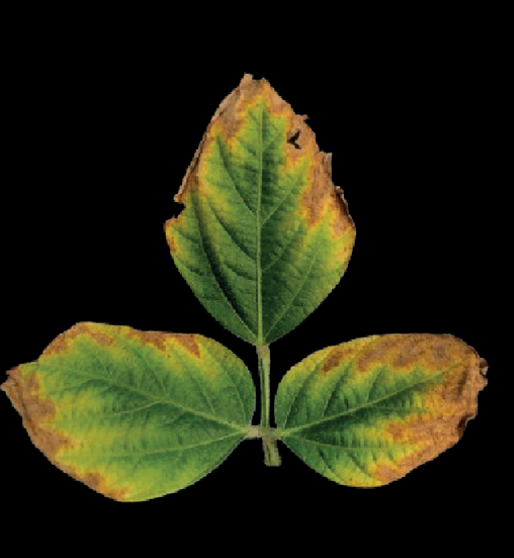 A deficiência de Potássio em soja limita a produtividade da soja, mesmo os demais nutrientes estando disponíveis em concentrações adequadas na solução do solo. Os sintomas de deficiência são observados nas folhas velhas da planta, começando pelo surgimentos de manchas marrons e clorose internerval, começando pelas bordas das folhas, evoluindo para a necrose (figura 3).