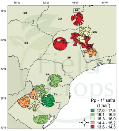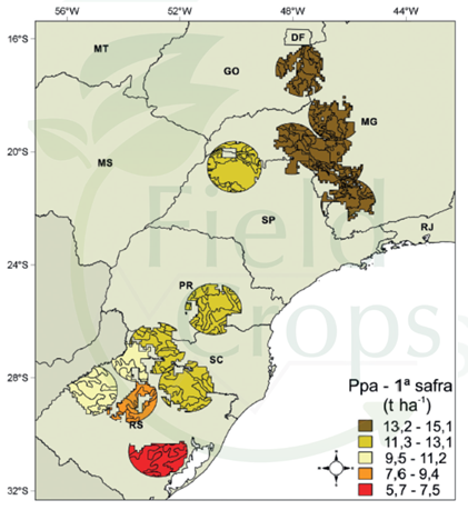 Para que as zonas climáticas escolhidas sejam representativas, elas devem, em conjunto, cobrir pelo menos 50% da área colhida na primeira e na segunda safra de milho no Brasil (Van Wart et al., 2013). O potencial de produtividade (PP) e o potencial de produtividade limitado por água (PPA) foram determinados pela equipe do Global Yield Gap Atlas – Milho (GYGA – Milho). Os resultados obtidos indicaram que os potenciais são superiores na primeira safra. Ao se considerar ambas as safras, o PP, em geral, é maior nas regiões mais ao Sul do país (Figuras 1 a 4).