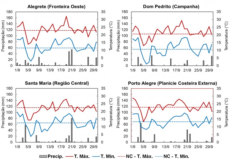 As chuvas foram frequentes em setembro, com quatro a seis eventos, dependendo da região. As temperaturas oscilaram, com mínimas ao redor dos 5°C, no início do mês, e passaram dos 30°C em alguns municípios, ao redor do 20 de setembro (Figura 2). A temperatura do ar mensal ficou dentro do padrão normal.