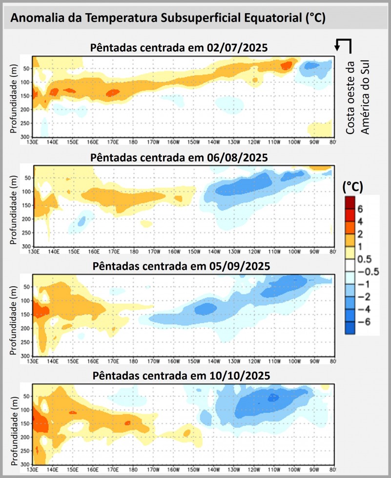 Segundo a atualização da NOAA (National Oceanic and Atmospheric Administration), de 09 de outubro de 2025, o sistema acoplado oceano-atmosfera no Oceano Pacífico equatorial refletiu as condições frias do ENOS (El Niño-Oscilação Sul), ou seja, condições de La Niña. No entanto, ao se analisar os dados, percebe-se que essa afirmação é um pouco forçada, visto que as águas mal resfriaram e ainda não se tem um mês completo com anomalias igual ou abaixo de -0,5°C. Alguns indicadores atmosféricos até tem respondido à fase fria do ENOS. No entanto, o IOS (Índice de Oscilação Sul) segue neutro. Em setembro, a anomalia mensal da temperatura da superfície do mar na região Niño 3.4 foi de -0,4°C, dentro do padrão Neutro e, na região Niño 1+2, foi de -0,2°C (Figura 3). A anomalia trimestral, referente a Jul-Ago-Set/2025, baixou para -0,3°C, também dentro da faixa de Neutralidade.