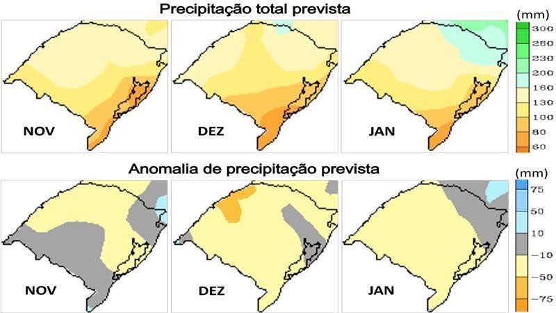 A tendência geral e corriqueira no RS, é de que as chuvas diminuam mais significativamente a partir de novembro, devendo prosseguir por dezembro e janeiro. Há a expectativa de que chuvas um pouco mais frequentes retornem a partir de final de janeiro ou fevereiro em diante, assim como na safra passada. Lembrando que as chuvas no período do verão são irregulares (mal distribuídas) e, com isso, pode ocorrer de chover mais em alguns locais, que outros.