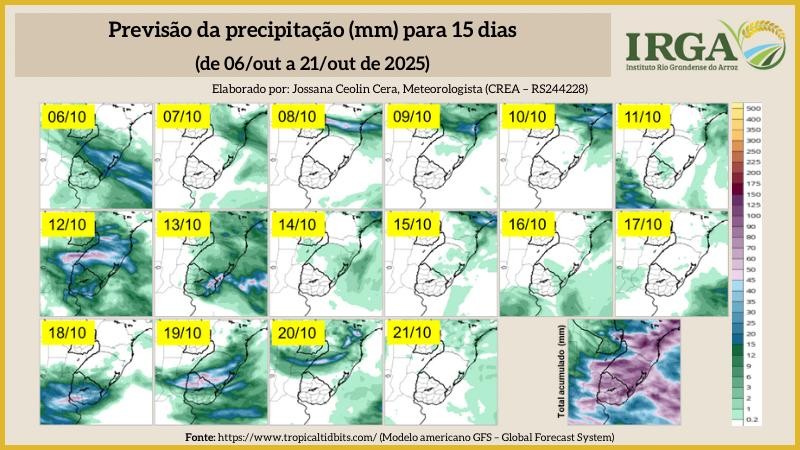 E, mais adiante, entre os dias 18, 19 e 20 de outubro, novas áreas de instabilidade voltarão a causar chuva no RS. Os acumulados previstos para os próximos 15 dias variam entre 70 e 120 mm, em média.