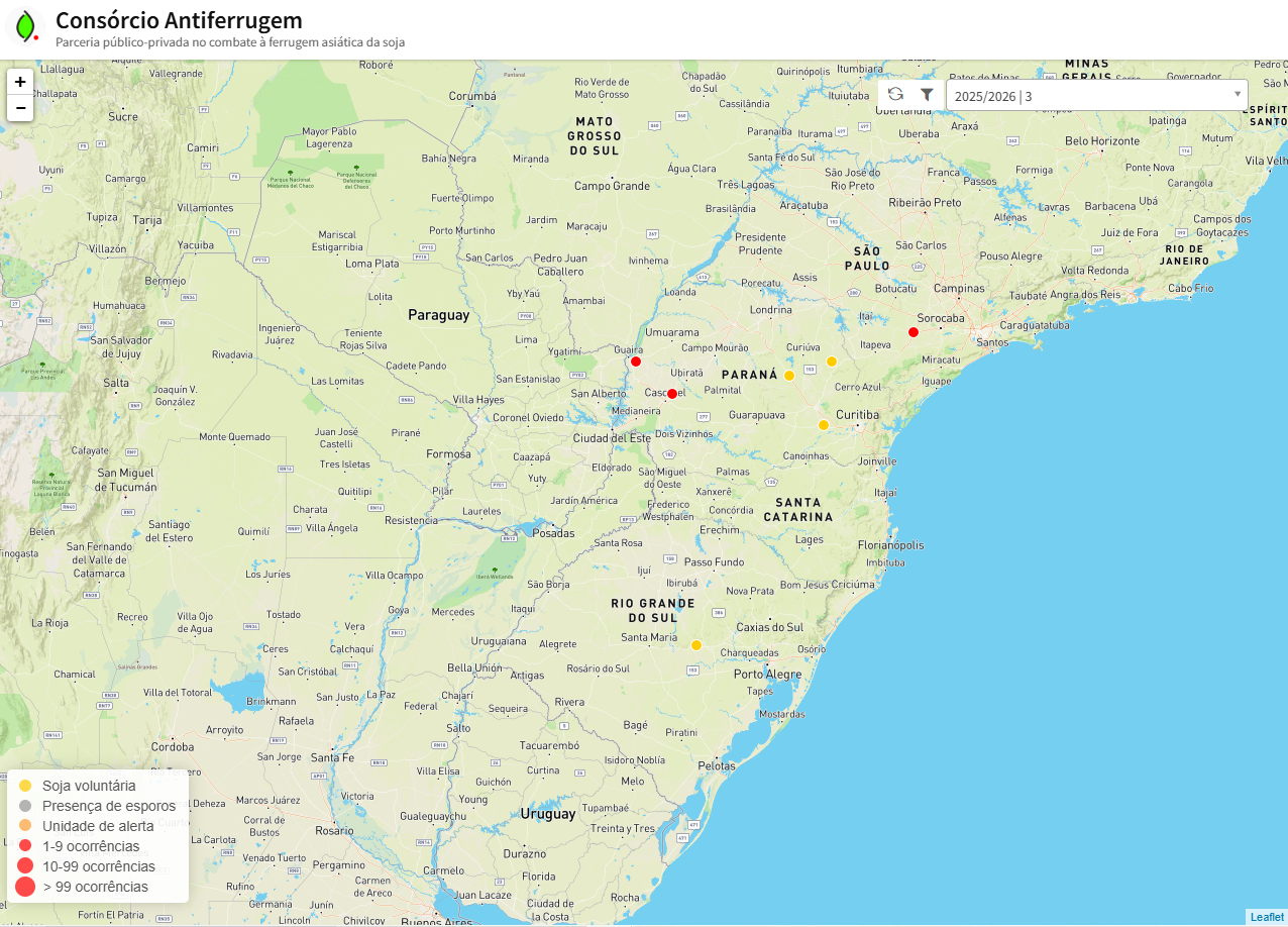 No Brasil, os primeiros registros de ferrugem-asiática já vêm ocorrendo em lavouras comerciais, sobretudo naquelas semeadas entre a primeira e a segunda quinzena de setembro. Em 18 de novembro, foi confirmado o primeiro caso da safra 2025/2026, no município de Corbélia (PR), em plantas de soja no estádio R3. O segundo registro ocorreu em 19 de novembro, no município de Itapetininga (SP), em lavoura no estádio R2. Ainda no Paraná, um terceiro caso foi reportado em 24 de novembro, no município de Terra Roxa, em soja no estádio R5. Todos os episódios foram observados em lavouras estabelecidas em setembro, reforçando a maior vulnerabilidade das semeaduras mais precoces ao avanço inicial da doença.