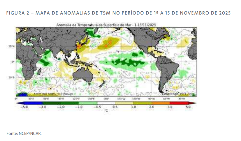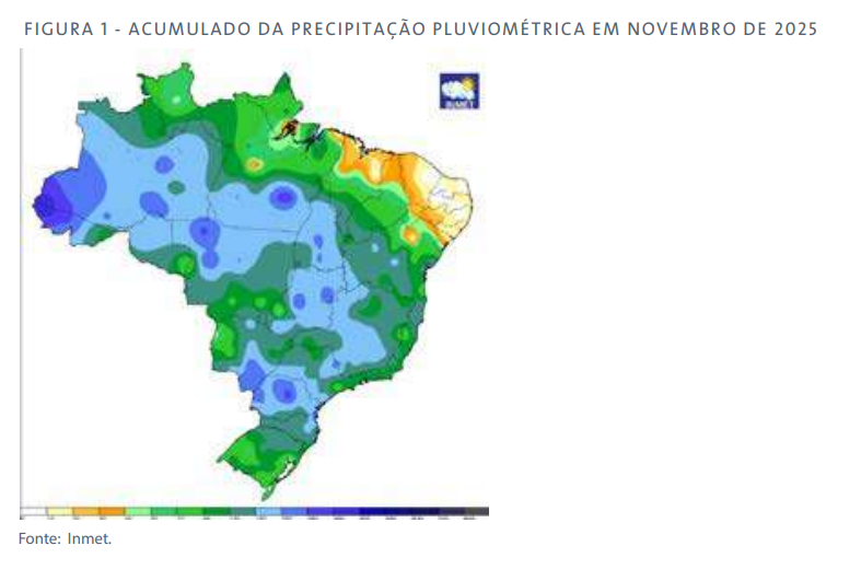 Em novembro de 2025, os maiores acumulados de chuva ocorreram no centro norte da Região Norte, parte norte de Mato Grosso, Goiás, Distrito Federal, no centro-sul de Mato Grosso do Sul, na porção central de Minas Gerais, sul de São Paulo e Paraná, com totais superiores a 150 mm, favorecendo a manutenção da umidade do solo nessas áreas. Por outro lado, a maior parte da Região Nordeste registrou volumes inferiores a 40 mm. O cenário foi especialmente crítico no leste do Ceará, Rio Grande do Norte, Paraíba, Pernambuco, Alagoas e extremo norte de Sergipe, onde os totais ficaram abaixo de 10 mm, reduzindo os níveis de umidade do solo.