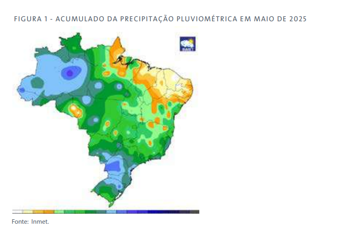Em outubro de 2025, os maiores acumulados de chuva ocorreram no oeste da Região Norte e grande parte da Região Sul, com volumes que ultrapassaram 120 mm, contribuindo para a manutenção da umidade do solo nessas áreas. No centro-norte da Região Nordeste e nordeste da Região Norte, menores acumulados de chuvas foram observados, reduzindo os níveis de umidade do solo. Já na parte central do Brasil, houve o retorno das chuvas em algumas áreas, mas ainda não foram suficientes para elevar os níveis de umidade da região.