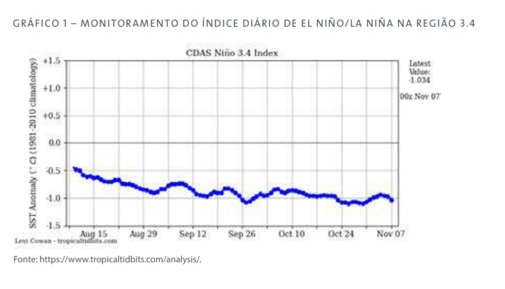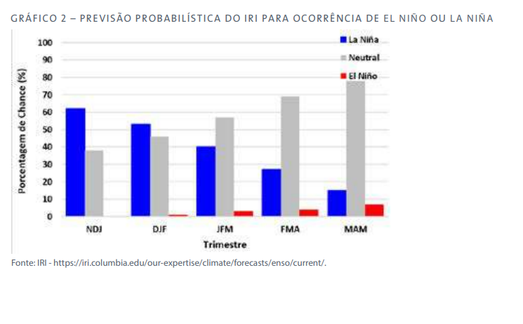 A análise do modelo de previsão do ENOS (El Niño – Oscilação Sul), realizada pelo Instituto Internacional de Pesquisa em Clima (IRI), aponta para o início do fenômeno La Niña durante o trimestre novembro, dezembro e janeiro de 2025/26, com probabilidade de 62% e persistência destas condições no próximo trimestre dezembro, janeiro e fevereiro de 2025/26, com uma probabilidade de 53%.