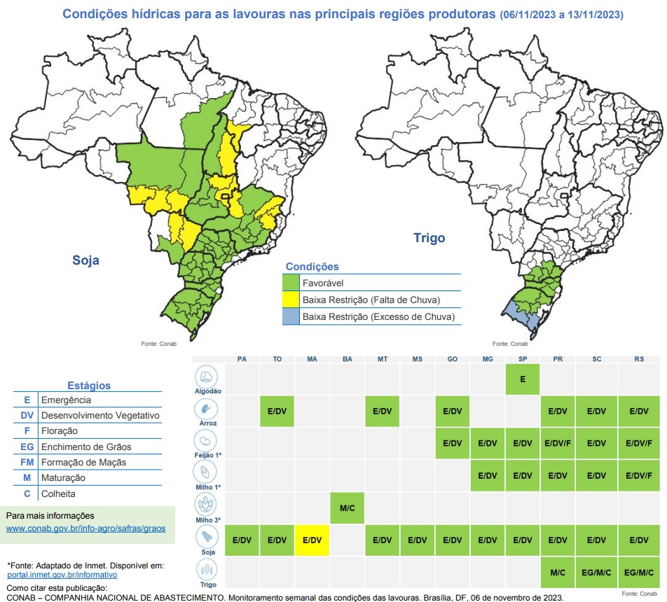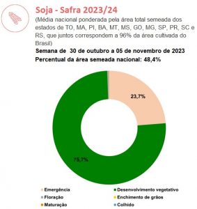 48,4% semeado. Em MT, o plantio avançou e a maioria das lavouras apresentam bom desenvolvimento, apesar da irregularidade das chuvas. No RS, a semeadura progrediu, principalmente nas áreas que estavam em pousio e nas áreas colhidas de trigo. As lavouras mostram bom desenvolvimento, embora as fortes chuvas ocorridas. No PR, as chuvas constantes têm atrasado a implantação das lavouras e a realização de tratos culturais. Mesmo assim, as áreas semeadas apresentam boas condições. Em GO, o plantio evoluiu em razão da melhoria do regime de chuvas, mas está atrasado em relação à safra passada. Em MS, as condições de umidade do solo, em todo o estado, permitiu uma forte evolução da semeadura. Em MG, o plantio está atrasado em relação à safra passada, porém, com o retorno das precipitações, os trabalhos no campo aceleraram. Na BA, as lavouras irrigadas apresentam bom desenvolvimento, enquanto nas áreas de sequeiro o plantio não foi iniciado devido ao clima seco. Em SP, as chuvas frequentes atrasam a semeadura. No TO, a irregularidade das condições climáticas tem impactado a evolução da semeadura. No MA, o plantio ocorre de forma lenta, em virtude da irregularidade das chuvas, e está concentrado no Sul do estado.