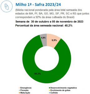 40,2% semeado. Em MG, as chuvas, mesmo irregulares, têm promovido a evolução da semeadura. No RS, as lavouras foram beneficiadas pela redução das chuvas e pelo retorno dos dias ensolarados. Os produtores estão aproveitando o tempo firme para a realização de tratos culturais. No PR, o plantio está sendo finalizado. As fortes precipitações diminuíram a velocidade de implantação da cultura, e também tem dificultado a realização de tratos culturais. Em SC, o plantio evoluiu pouco devido ao excesso de precipitações. O tempo encoberto também prejudica o desenvolvimento das lavouras. Em SP, o plantio avança, mas os produtores estão priorizando a semeadura da soja. Em GO, devido a irregularidade das chuvas, tem-se priorizado a semeadura da soja. Na BA, a semeadura não foi iniciada devido a baixa umidade no solo e a irregularidade das chuvas.