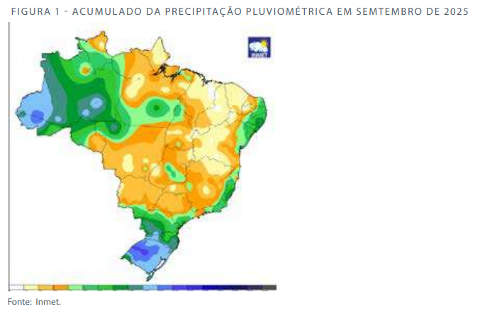 Em setembro de 2025, os maiores acumulados de chuva ocorreram no oeste da Região Norte e em parte da Região Sul, com volumes que ultrapassaram 120 mm, contribuindo para a manutenção da umidade do solo nessas áreas. Já no interior da Região Nordeste e parte central do país, menores acumulados de chuvas foram observados, reduzindo os níveis de umidade do solo.