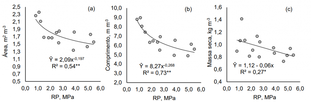 Figura 1. Área (a), comprimento (b) e massa seca (c) de raízes da soja (BRS 359 RR) na camada de 0-20 cm, em função da resistência mecânica à penetração (RP) de um Latossolo Vermelho muito argiloso, determinada na capacidade de campo.