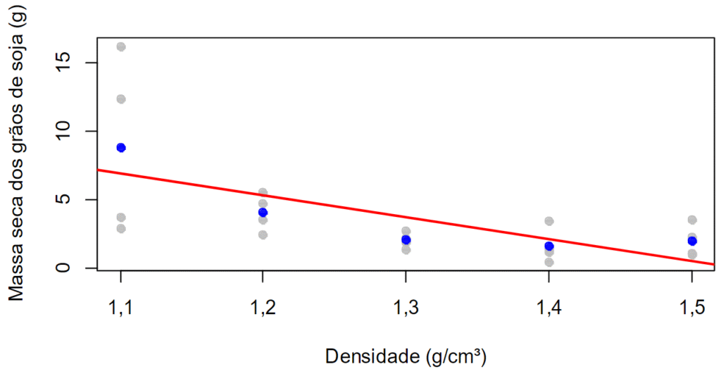 Figura 2. Regressão linear simples de massa seca de grãos de soja em função da densidade do solo (1,1; 1,2; 1,3; 1,4 e 1,5g cm-3)