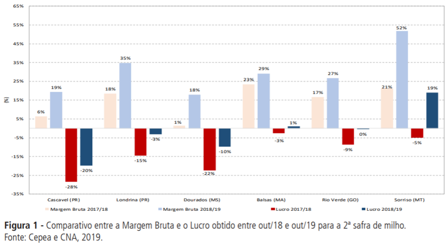 Na média das praças de Balsas (MA), Sorriso (MT) e Rio Verde (GO), a margem bruta foi de 36% em outubro/19. Vale ressaltar que, dentre as regiões analisadas, Sorriso foi a que teve o resultado mais favorável, gerando uma margem bruta de 52% e lucro de 19%, sendo que o último é atípico para o milho. Balsas (MA) também gerou lucro, de 1%. Historicamente, a receita bruta não remunera todos os fatores econômicos envolvidos na produção do milho segunda safra nas regiões de Sorriso e Balsas.
