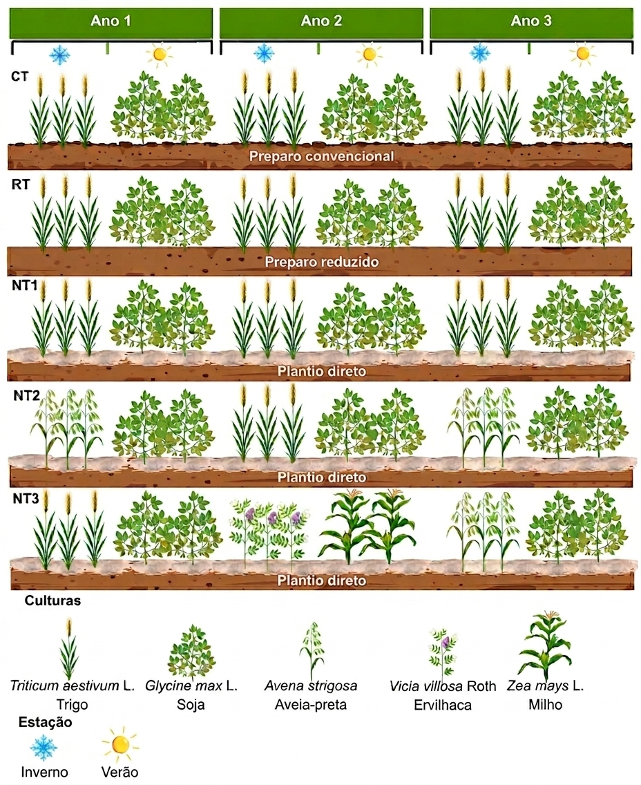 O estudo desenvolvido pelos autores foi resultado de 32 anos de pesquisa, em que a sequências de culturas foi implementada continuamente em ciclos de três anos. Os três primeiros tratamentos corresponderam ao sistema de sucessão mais predominante, que inclui trigo e soja, sob diferentes níveis de preparo do solo: preparo convencional (PC), preparo reduzido (PR) e plantio direto (PD1). Além disso, foram incluídas duas rotações diversificadas de plantio direto: PD2, composta por aveia preta e soja, trigo e soja, e aveia preta e soja; e PD3, composta por trigo e soja, ervilhaca e milho, e aveia preta e soja, representados na figura 1 (Algarin et al., 2025).