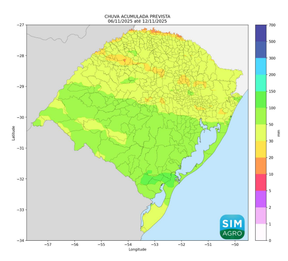 As informações constam no Boletim Integrado Agrometeorológico 45/2025, produzido pela Secretaria da Agricultura, Pecuária, Produção Sustentável e Irrigação (Seapi), em parceria com a Emater/RS-Ascar e o Instituto Rio Grandense do Arroz (Irga).