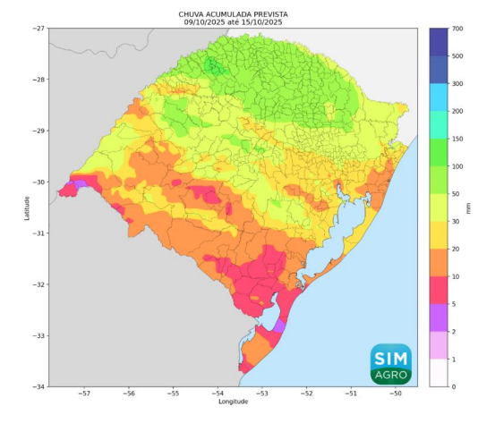 Os acumulados de precipitação previstos variam entre 10 e 100 milímetros. Nas áreas centrais e do norte, os volumes podem superar os 100 mm em pontos isolados, enquanto no extremo sul os totais tendem a ser menores, não ultrapassando 50 mm.