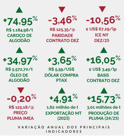 DECLÍNIO: a paridade de exportação do contrato de dez/25 desvalorizou 3,46% em relação ao contrato equivalente de 2024, reflexo da redução do preço do algodão na bolsa de NY.