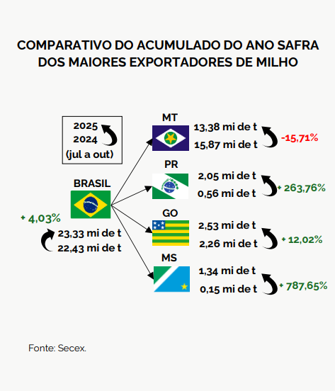Segundo a Secex, o Brasil exportou 6,49 mi. de t de milho em out/25, aumento de 1,51% em relação ao mesmo mês do ano anterior
