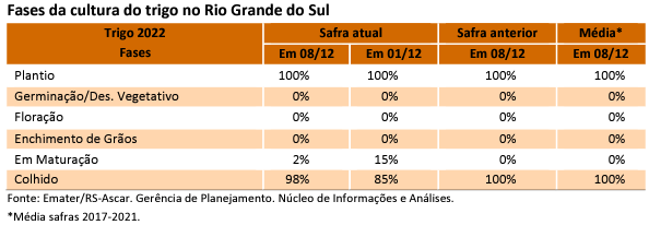 Na de Porto Alegre, a área colhida alcançou 90%. Contudo, a perspectiva é de que a colheita se encerre ainda na primeira quinzena de dezembro. No período, houve acionamento de Proagro em algumas lavouras com maturação irregular.