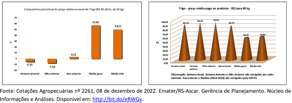 Aumentou o número de regiões com a colheita finalizada. O índice evoluiu para 98% da área cultivada. Restam cultivos em final de maturação, localizados mais a leste do Estado. A atividade apresenta excelentes resultados produtivos, em volume e em qualidade. A classificação comercial obtida é a melhor possível, com peso hectolitro (PH) elevado, o que indica a alta proporção de endosperma em relação à casca, garantindo um maior rendimento de farinha por grão. São pontuais os casos de produções insatisfatórias, especialmente associados a algumas condições extremas, como geadas, granizos ou excesso de chuvas.