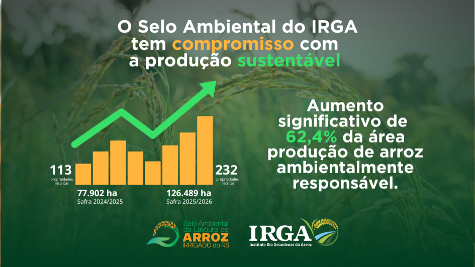 Com o compromisso de fomentar a produção sustentável de arroz, alinhada às legislações vigentes e às boas práticas de manejo que asseguram qualidade de vida aos envolvidos na cadeia orizícola, o Selo Ambiental da Lavoura de Arroz Irrigado do Rio Grande do Sul, promovido pelo Instituto Rio Grandense do Arroz (IRGA), tem impulsionado a expansão das áreas de cultivo ambientalmente responsável.