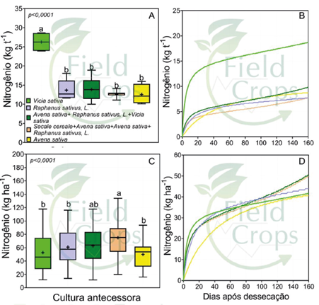 Figura 1. Nitrogênio acumulado na biomassa seca acima do solo de culturas de cobertura (A, C), liberação de nitrogênio da degradação do N acumulado na biomassa seca acima do solo de culturas de cobertura (B,D). Letras minúsculas comparam o efeito pelo teste de média de Tukey (α < 0,05).