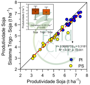 Figura 1. Produtividade da soja única versus soja no sistema de produção trigo-soja. A cor azul representa os potenciais irrigados (PI) e a cor amarela, o potencial de produtividade de sequeiro (PS). A linha diagonal sólida preta indica y = x.
