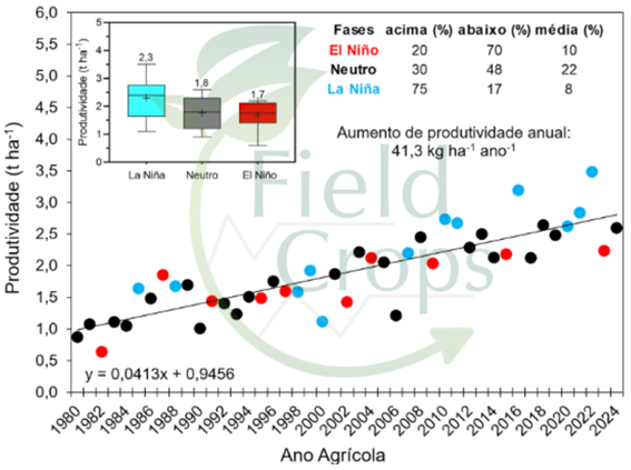 Figura 2. Associação entre a produtividade média de trigo no Sul do Brasil, e a ocorrência do fenômeno ENOS entre 1980 a 2024. Na inserção está a média de produtividade das diferentes fases do fenômeno ENOS. As cores indicam as fases do fenômeno ENOS. A linha preta representa a tendência de aumento da produtividade de trigo na série histórica.