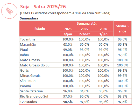 No Centro e Oeste, a semeadura acompanha a ocorrência das chuvas, devendo se prolongar até meados de fevereiro. Em SC, o plantio da 1ª safra foi finalizado e o desenvolvimento da cultura é considerado satisfatório, com bom potencial produtivo. No PA, o plantio continua atrasado nos polos de Paragominas e Santarém devido à irregularidade das chuvas. Nos polos da BR-163 e Redenção, as lavouras apresentam bom desenvolvimento e a colheita se aproxima do início.
