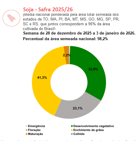 Em MT, a colheita foi iniciada nas lavouras de variedades precoces. Apesar dos altos volumes de chuva, os produtores estão conseguindo explorar eficientemente as janelas de tempo seco. No RS, as chuvas ocorridas mantiveram os bons índices de armazenamento de água no solo, favorecendo o desenvolvimento da cultura. Entretanto, essas condições têm favorecido o aumento de casos da ferrugem asiática e prejudicaram lavouras semeadas em áreas de baixada, anteriormente semeadas com arroz. No PR, a colheita já ocorre no oeste do estado e as precipitações ocorridas favoreceram o desenvolvimento da cultura.