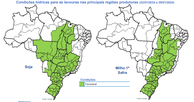 manterão favoráveis para os cultivos de primeira safra, bem como para as lavouras de café e cana-de-açúcar.