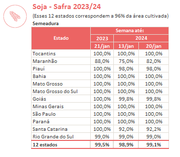 Em GO, as lavouras de ciclo médio e tardio estão se recuperando melhor com as chuvas recentes. As áreas mais precoces estão em colheita. Em MS, a colheita ocorre em ritmo lento. As lavouras estão principalmente em fases reprodutivas. Em MG, as lavouras mais tardias vêm se beneficiando das chuvas recentes. Áreas mais precoces registram perdas pelo calor e estiagem.